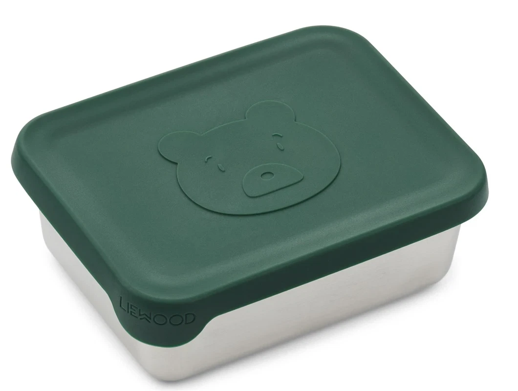 Snackboks i rustfrit stål med silikonelåg i farven garden green med Mr bear-motiv fra Liewood.