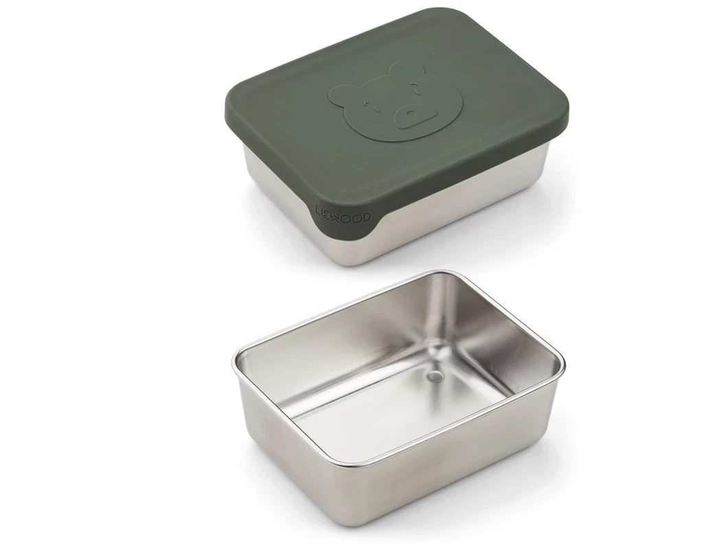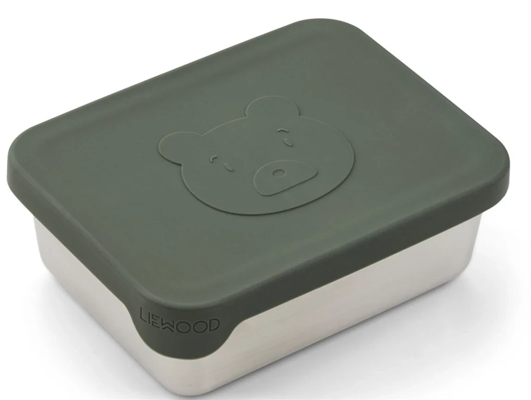 Snackboks i rustfrit stål med silikonelåg i farven hunter med Mr bear-motiv fra Liewood.