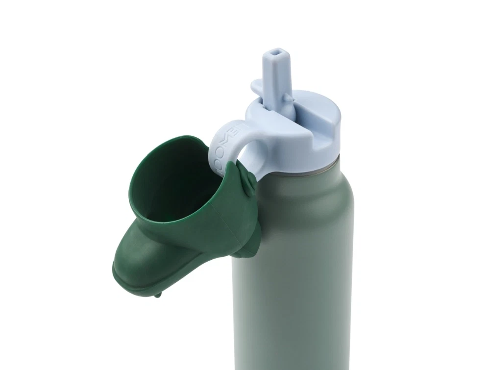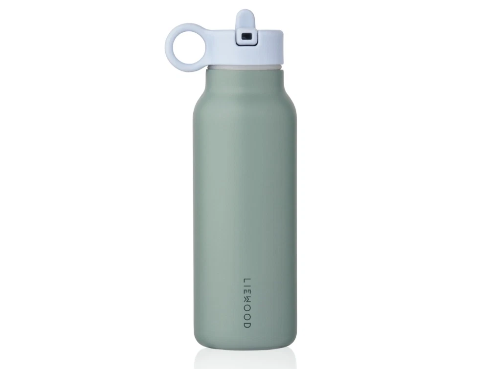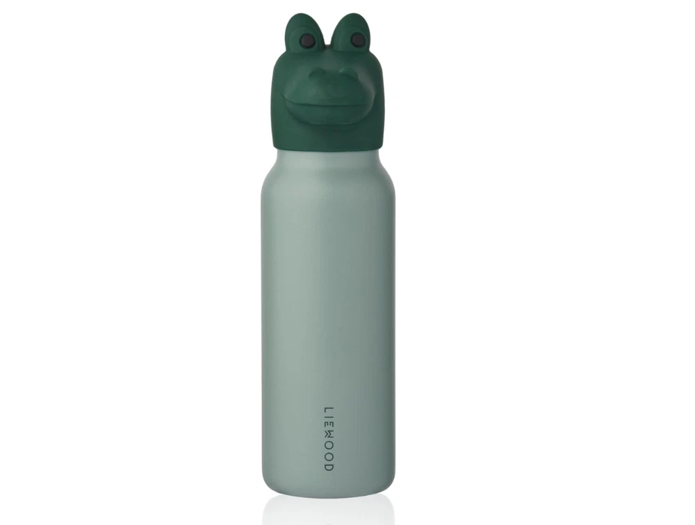 Drikkedunk i grøn nuance med krokodillelåg fra Liewood. Nils flasken er fremstillet i 80% genanvendt rustfrit stål og designet, så små hænder nemt kan holde den.