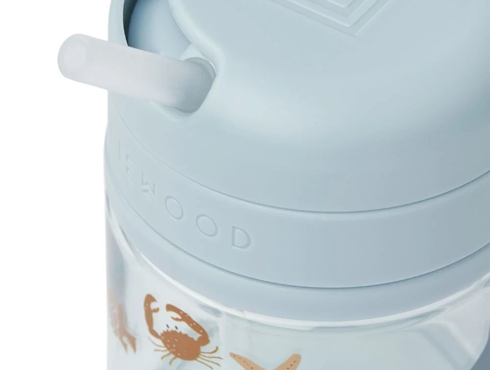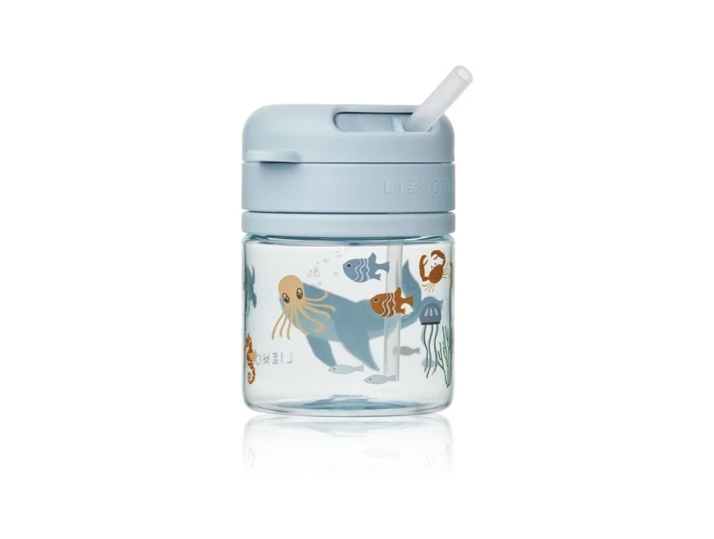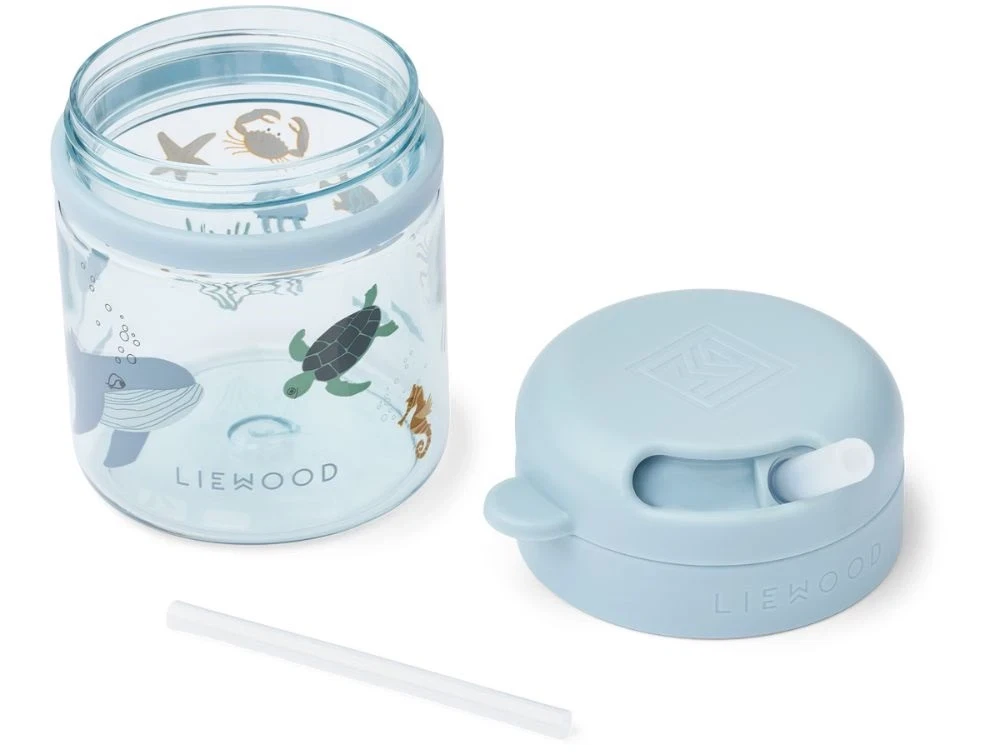 Praktisk sugerørskop fra Liewood i lyseblå med et skønt print af havdyr. Koppen har en smart drej-og-lås mekanisme, der sikrer, at den forbliver lukket, når den ligger i tasken.