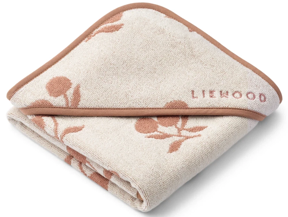 Indfarvet babyhåndklæde med hætte i farven sea shell med ferskenmotiver fra Liewood.