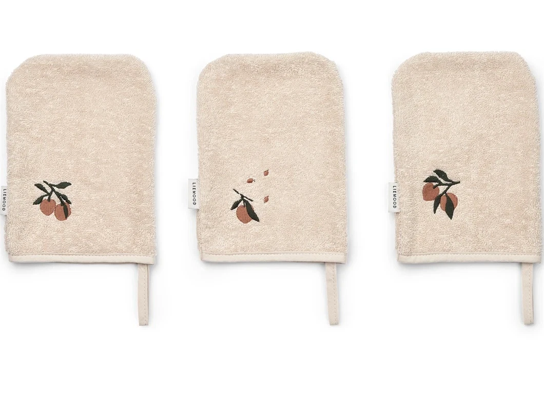 3 vaskeklude i økologisk bomuld i farve peach med lille broderi af ferskener fra Liewood.