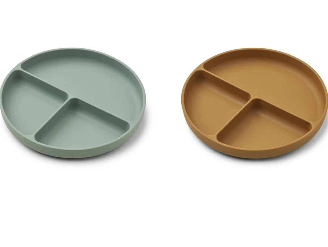 2 brudsikre tallerkener med opdeling til baby og børn i farverne peppermint og golden caramel mix fra Liewood.