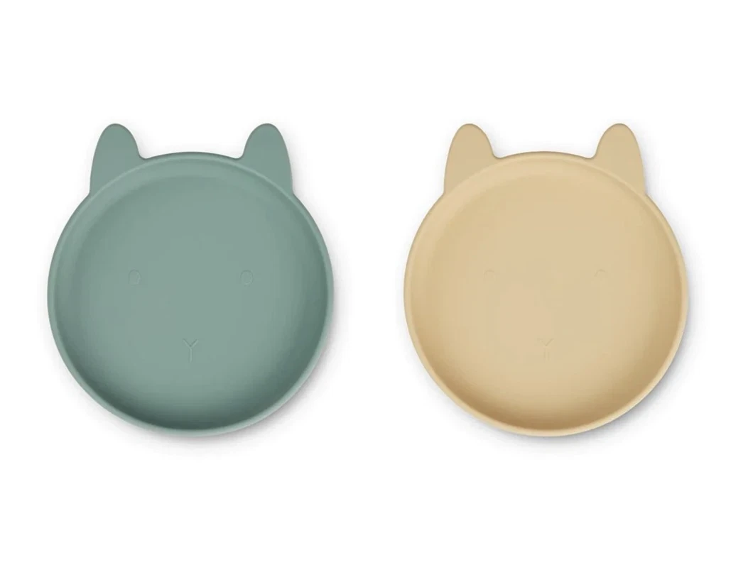 To fine tallerkener i silikone med dyreformede ører i farverne rabbit peppermint wheat yellow mix fra Liewood.