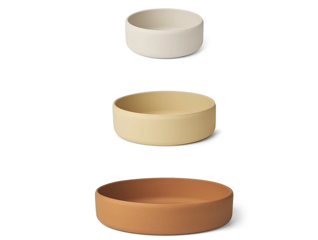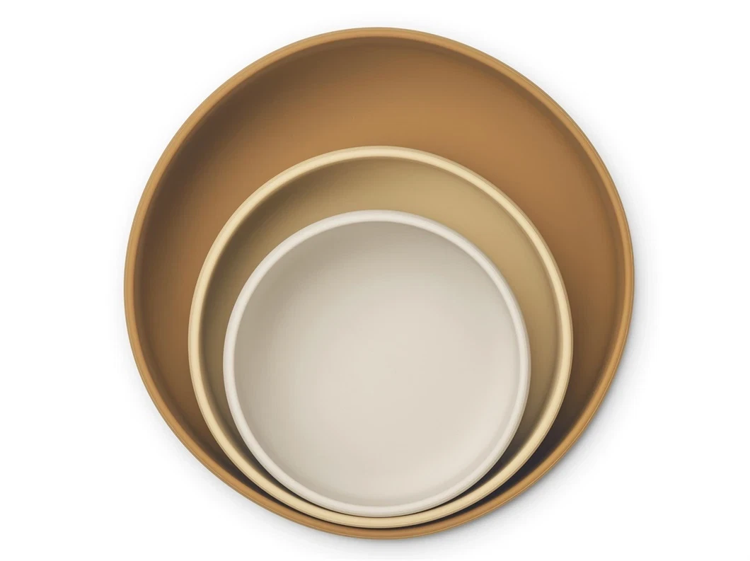 Sæt med tre skåle i forskellige størrelser i farven safari multi mix fra Liewood.