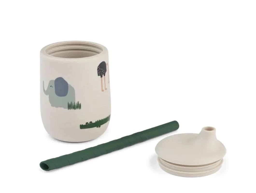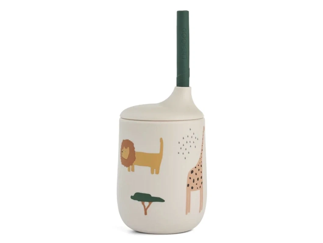 Brudsikker kop til baby og børn i farven sandy med safariprint og sugerør fra Liewood.