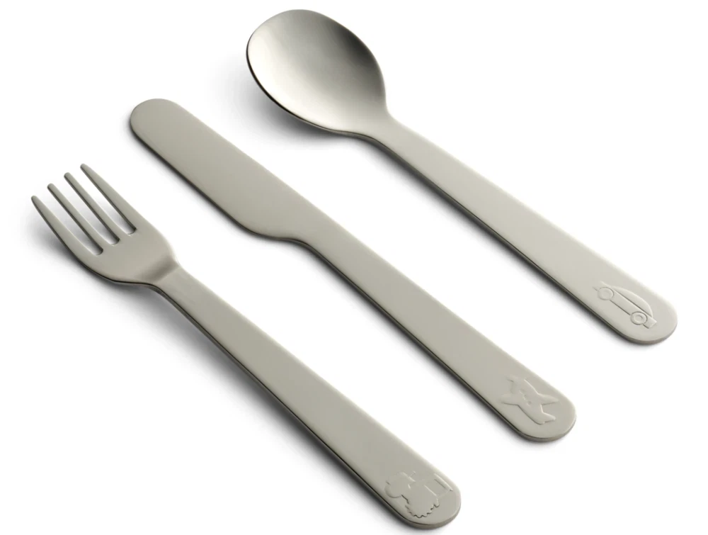 Tåler opvaskemaskine, hvilket gør rengøringen enkel. Sættet indeholder en gaffel, en kniv og en ske.