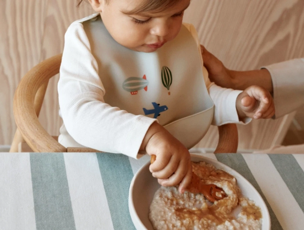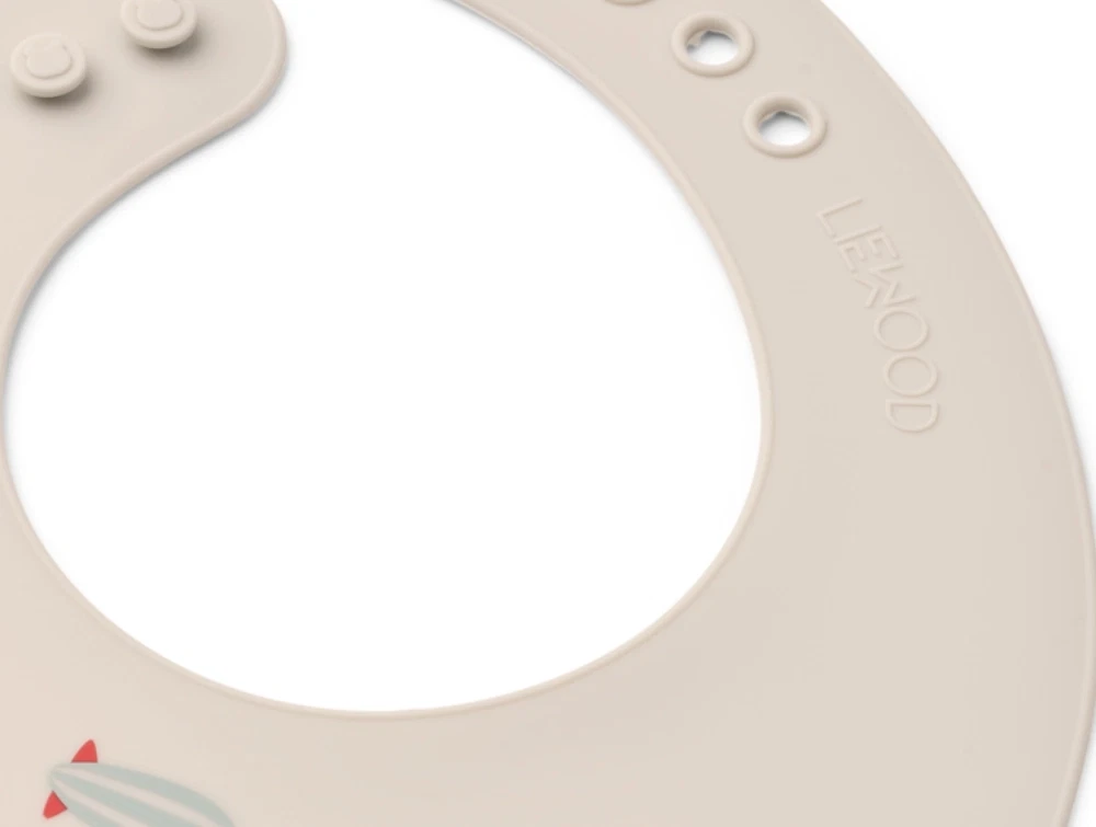 Hagesmæk i ecru nuance fra Liewood med aviator-print. Tilda printed bib er fremstillet i blød silikone og designet til at gøre spisetid mere overskuelig med en praktisk opsamlingslomme foran.