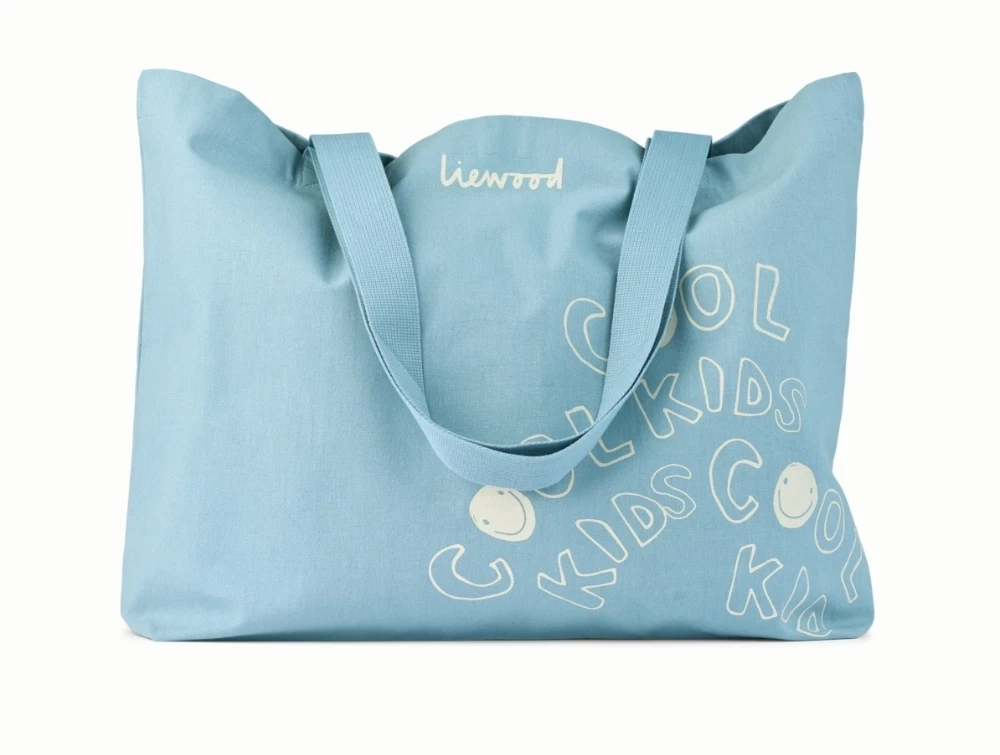 Stor totebag i lys blå nuance (beach blue) fra Liewood med cool kids-print.