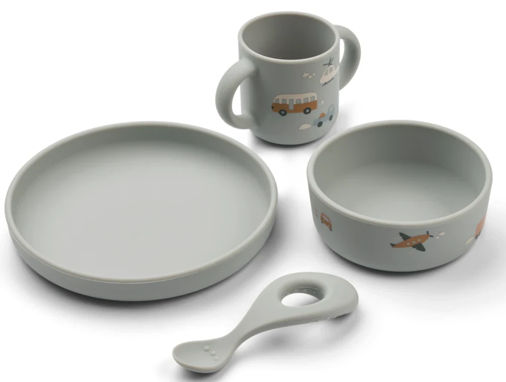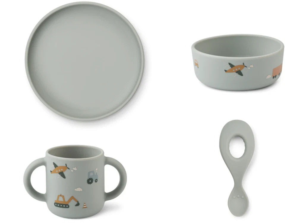 Sættet indeholder en kop, en skål, en tallerken og en ske, der alle er lavet af slidstærk silikone. Silikone er et brudsikkert alternativ til plastik og porcelæn, hvilket gør det ideelt til små børn, der udforsker spisning på egen hånd.