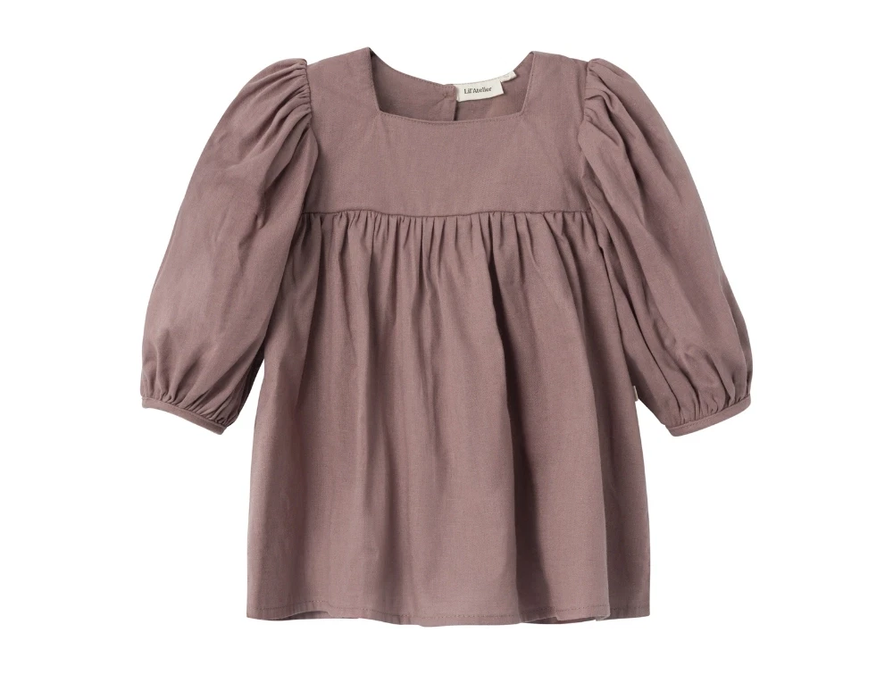 Løs top i farven antler med knaplukning i ryggen og pufærmer fra Lil' Atelier.