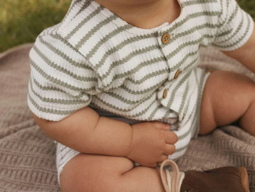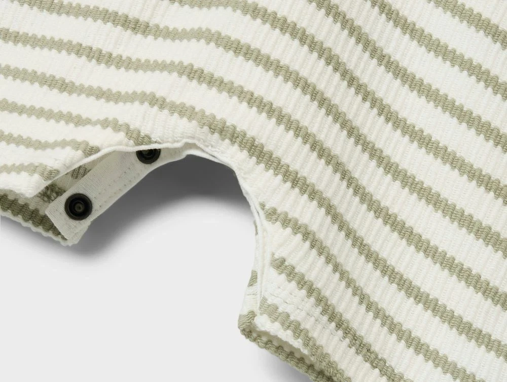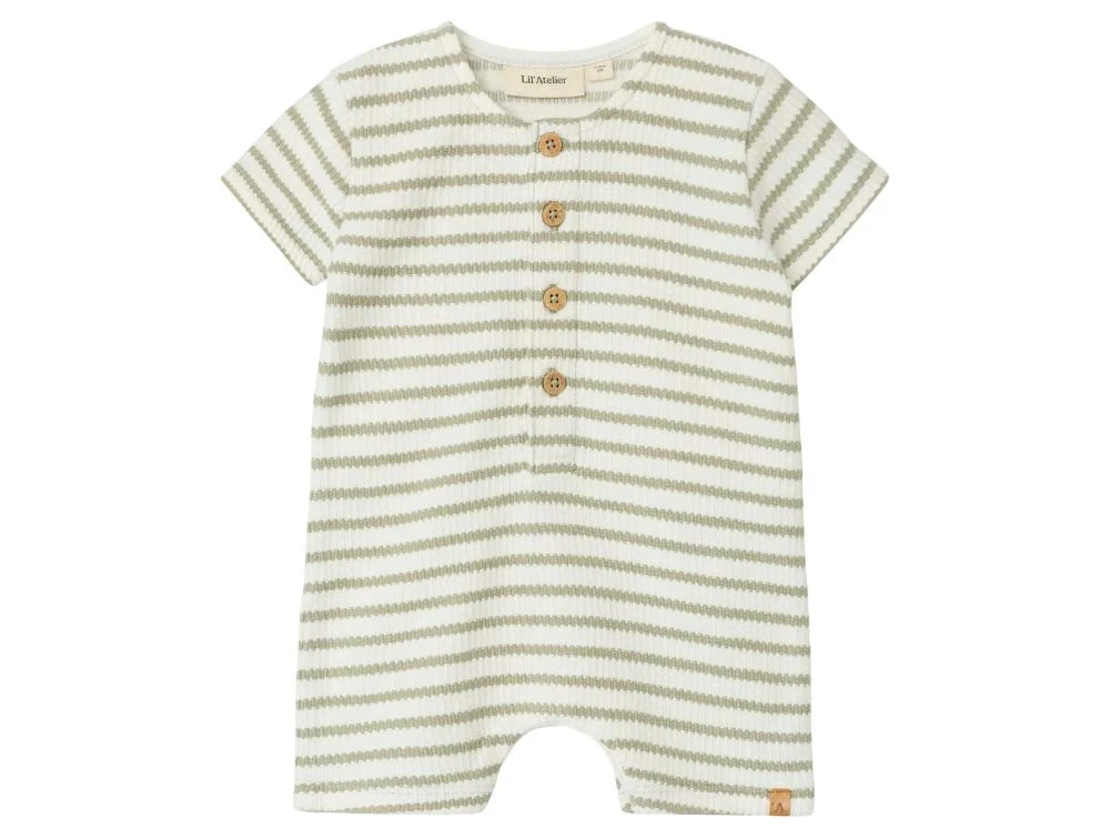 Kortærmet babyjumpsuit i råhvid nuance med grønne striber fra Lil' Atelier.