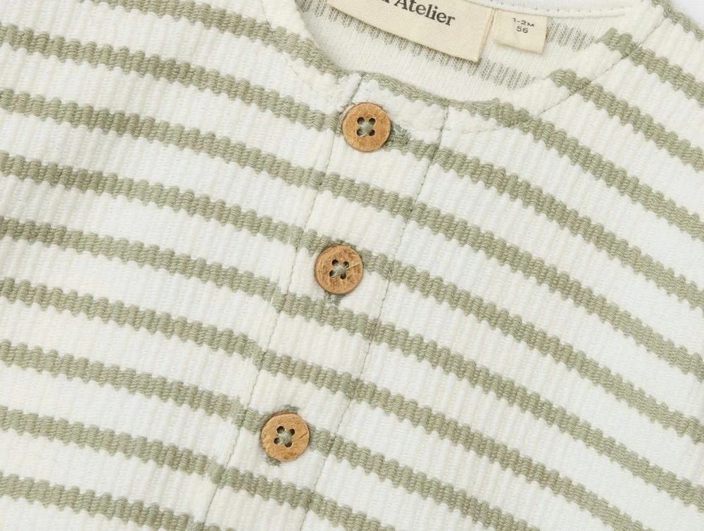 Lil\' Atelier jumpsuit i seagrass med grønne striber og knapperBaby iført Lil\' Atelier jumpsuit med grønne striberLil\' Atelier jumpsuit med praktiske trykknapper mellem beneneKortærmet Lil\' Atelier jumpsuit med striber i grønne nuancer