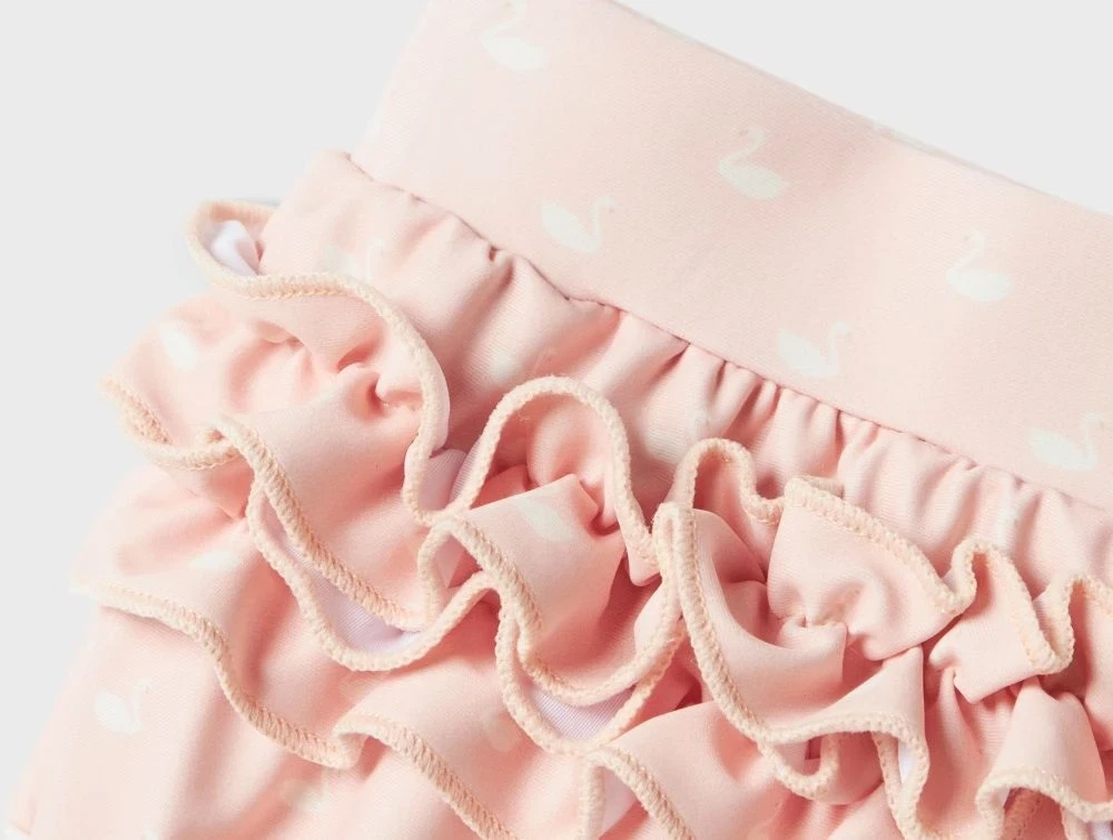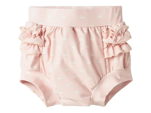 Søde badebloomers i rosa (peach whip) med fine hvide svaner. Modellen har flæsedetaljer i siderne og bagpå, som giver et feminint og legende udtryk. De er designet til babyer og har blødt strækstof i taljen og ved lårene, hvilket sikrer en behagelig pasform og god bevægelsesfrihed – ideel til strand og pool.