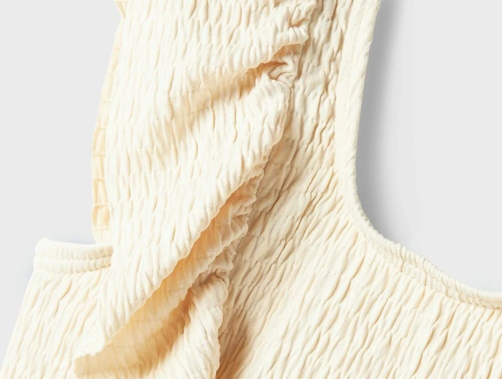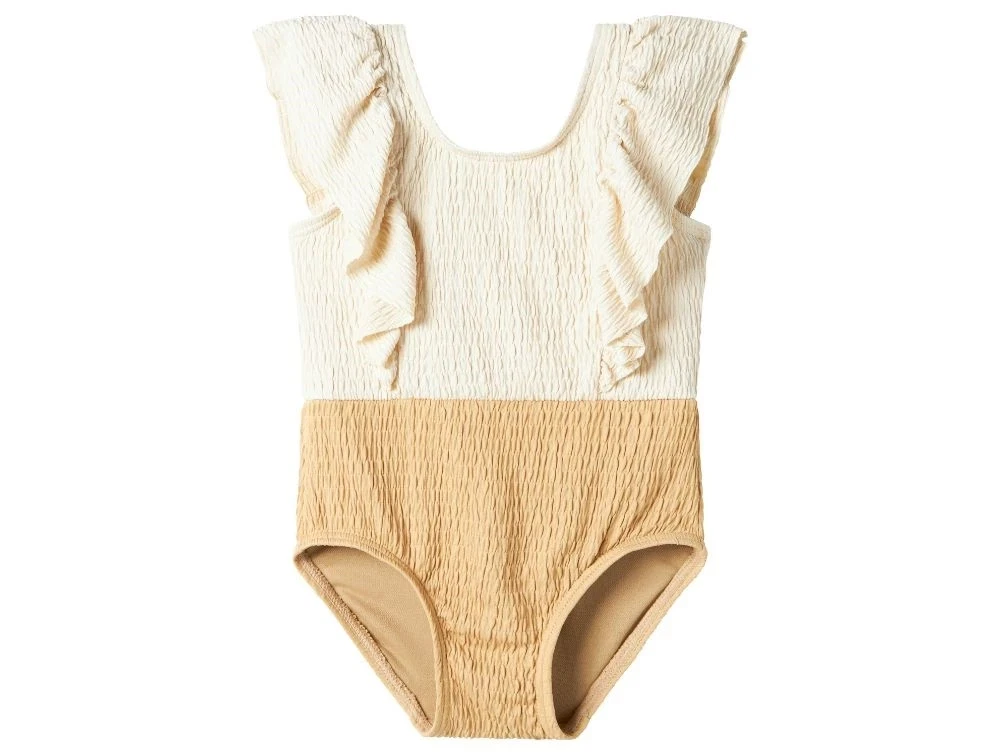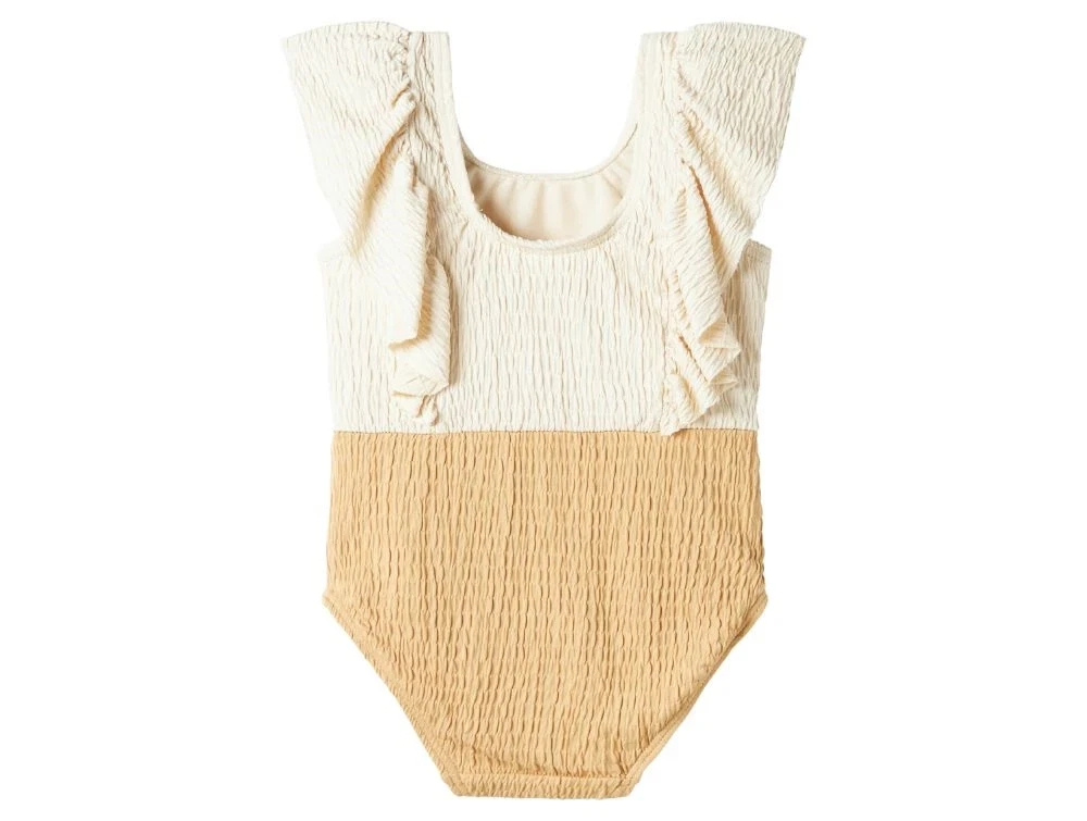 Sød badedragt med flæsedetaljer hen over skuldrene og smock-effekt i stoffet, som giver et let rynket og fleksibelt udtryk. Den øverste del er i råhvid, mens den nederste del har en lys gylden brun nuance. Badedragten er lavet i en strækbar og hurtigtørrende kvalitet – perfekt til solrige dage ved strand og pool.