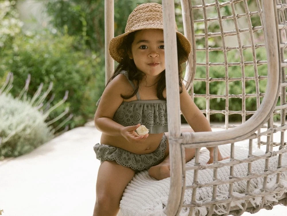 Bikini i støvet grøn (forest fog) med blondeflæser fra Lil' Atelier.