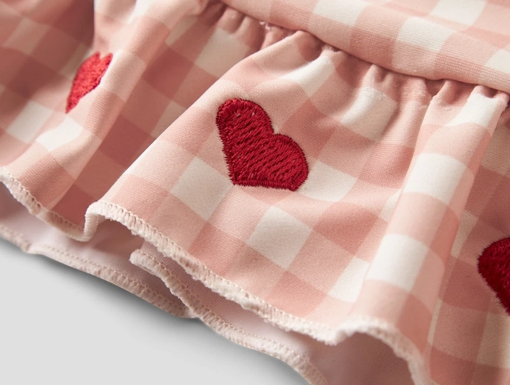 Sættet har ternet mønster og en dekorativ flæsekant med små broderede hjerter.