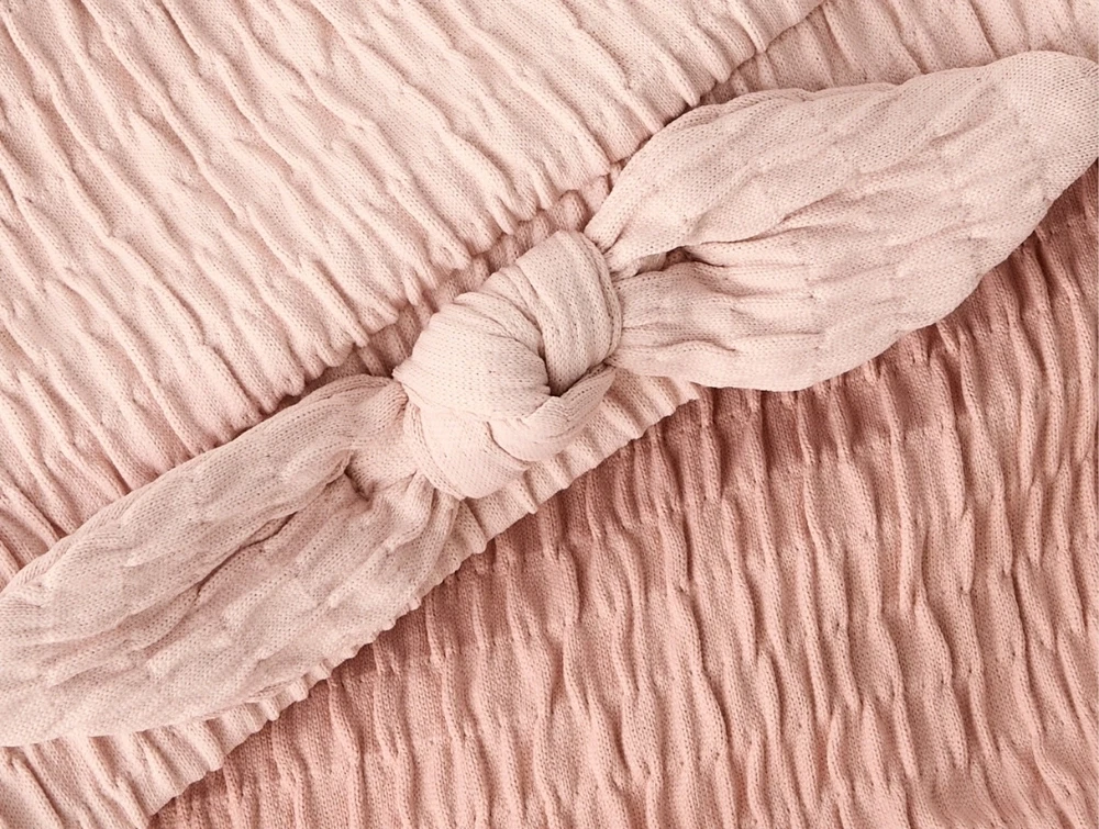 Sættet har en crepe-struktur i stoffet og en dekorativ sløjfedetalje foran. Overdelen har en lidt lysere nuance end underdelen, hvilket giver en diskret farvekontrast.
