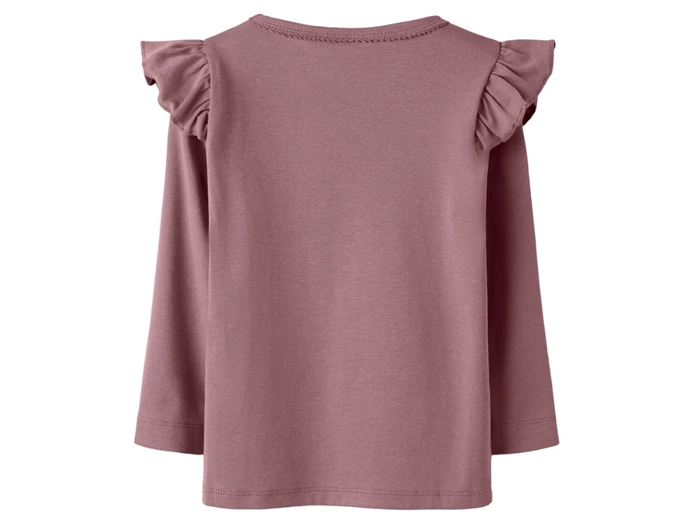 Pige iklædt Lil\' Atelier bluse i lilla nuance nostalgia rose stylet med nederdelLil\' Atelier bluse i lilla nuance nostalgia rose med flæser foranLil\' Atelier bluse i lilla nuance nostalgia rose med flæsedetalje på skulderLil\' Atelier bluse i lilla nuance nostalgia rose set bagfra