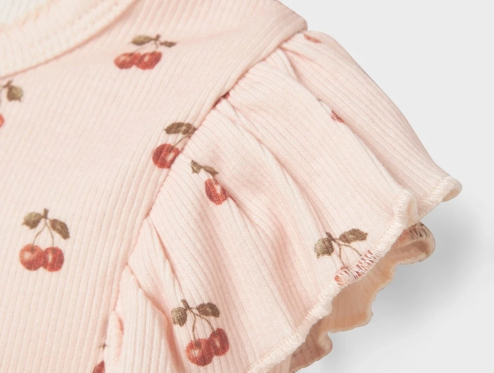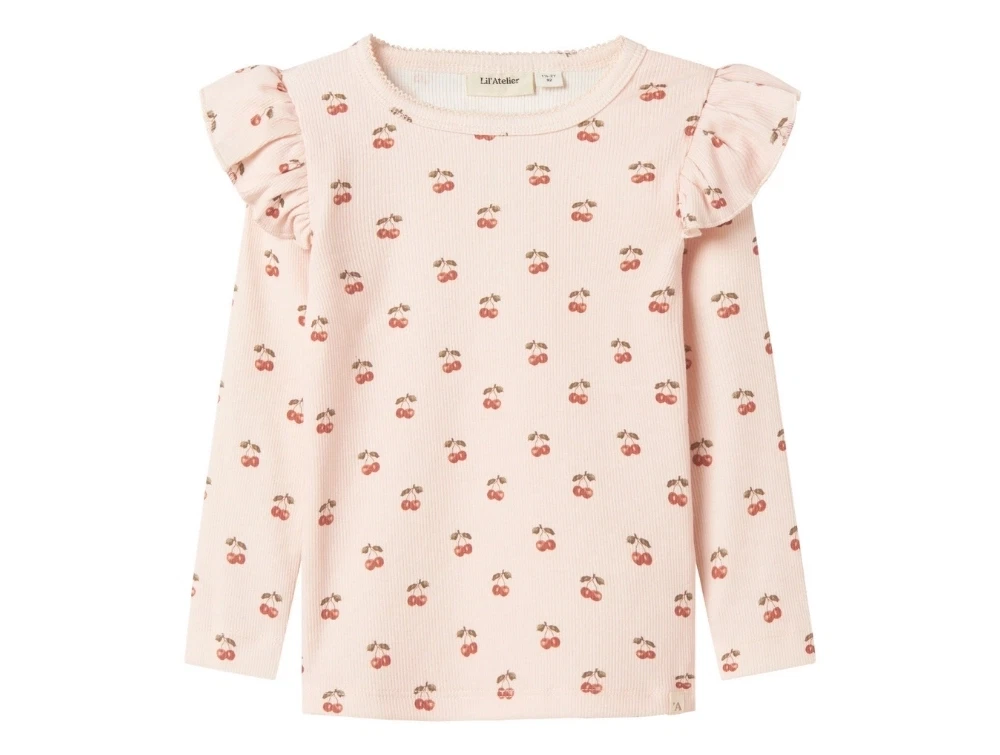 Bluse i lys rosa nuance fra Lil' Atelier med et fint kirsebærprint. Den bløde ribkvalitet giver et behageligt stræk, så barnet nemt kan bevæge sig. Flæserne på skuldrene tilføjer et sødt og feminint udtryk, der passer perfekt til hverdagsbrug.