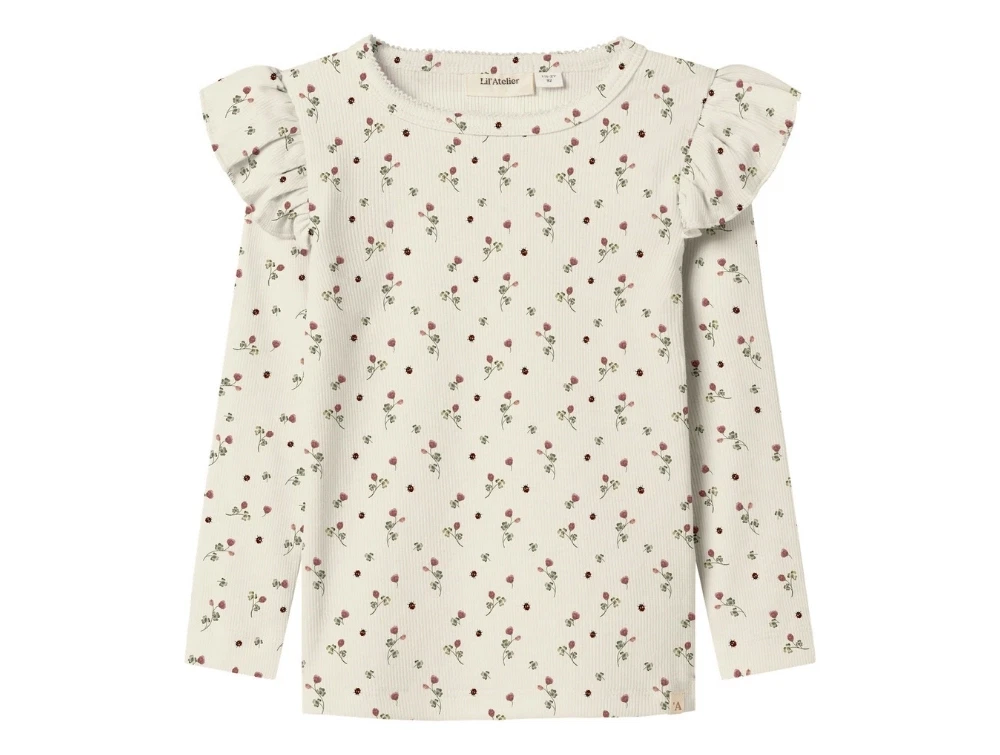 Bluse i råhvid nuance fra Lil' Atelier med små blomsterprint i rosa og grønne nuancer. Den bløde ribkvalitet giver et behageligt stræk, så barnet kan bevæge sig frit i hverdagen. Flæserne på skuldrene tilfører et sødt og feminint udtryk.