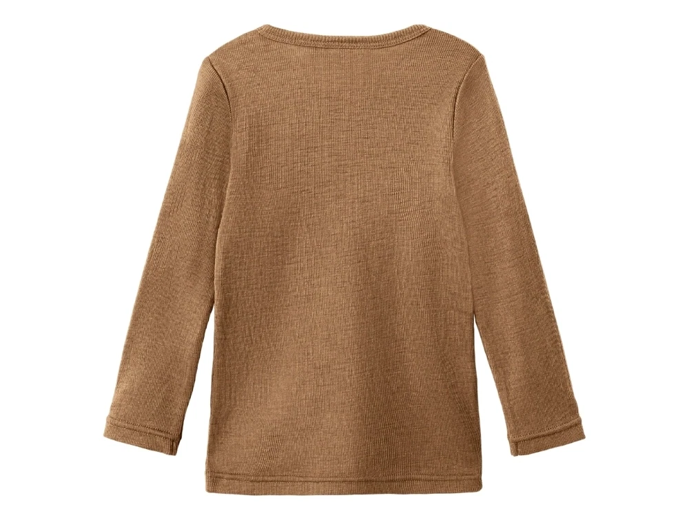 Baren iklædt Lil\' Atelier bluse tigers eye i merinould med knapperLil\' Atelier bluse i tigers eye uld til børnDetalje af Lil\' Atelier bluse i tigers eye uldBagside af Lil\' Atelier bluse i tigers eye uld
