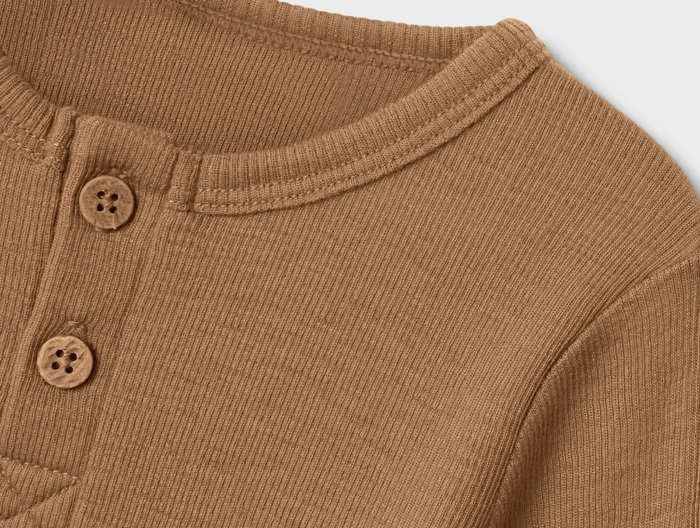 Blusen har lange ærmer, grandad-hals med knapper foran og en slim pasform, der gør den velegnet som basislag eller enkel style.