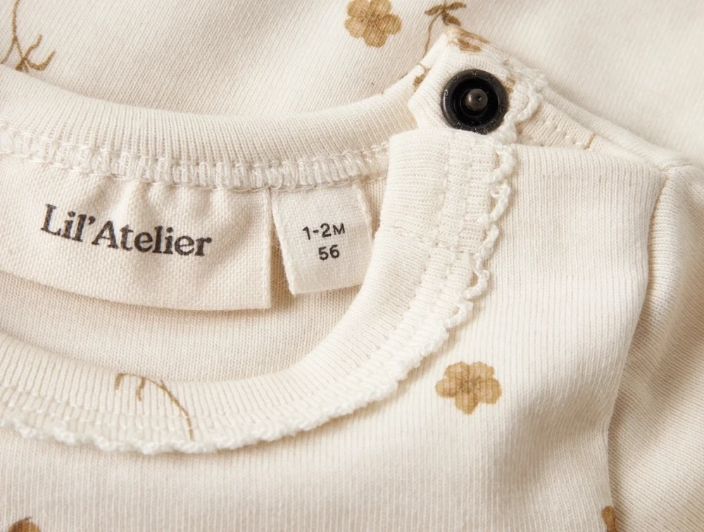 Lil\' Atelier body i råhvid nuance med gyldent blomsterprintLil\' Atelier body coconut milk med trykknap ved skulderLil\' Atelier langærmet body med blomsterprint