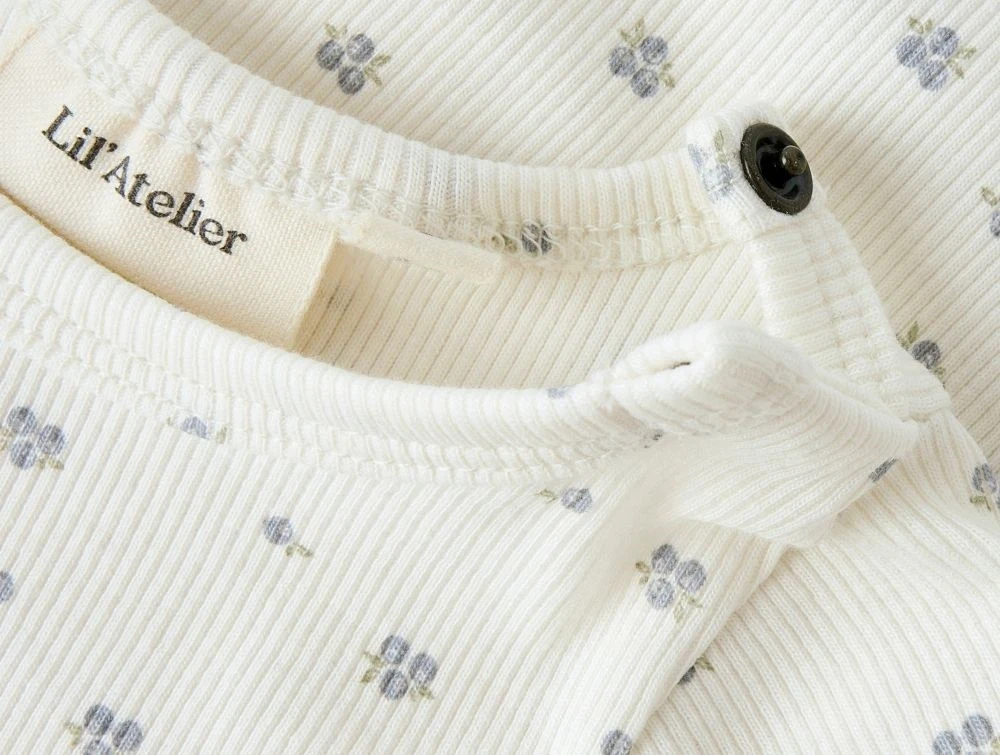 Ribstrikket body i råhvid nuance (coconut milk) fra Lil' Atelier med et sødt all-over print af små blåbær. Bodyen har lange ærmer og trykknapper mellem benene, som gør den nem at åbne og lukke.