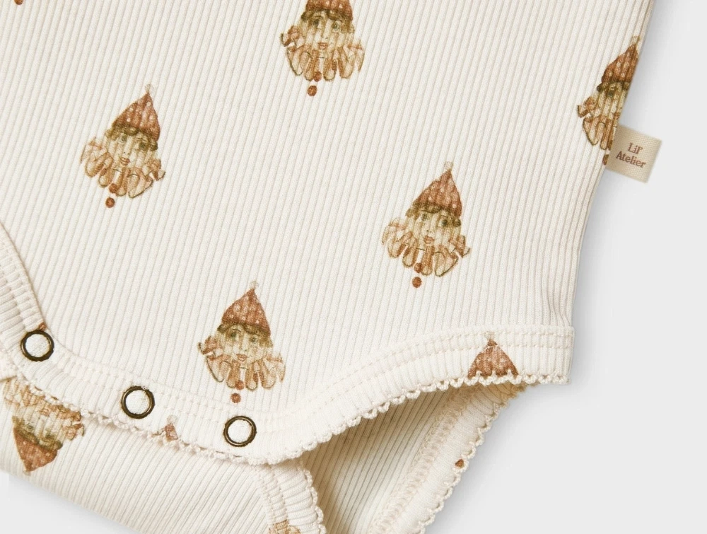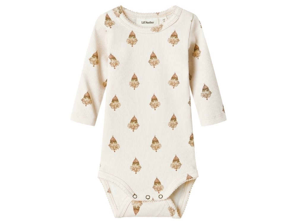 Ribstrikket body i beige nuance med klovneprint fra Lil' Atelier. Den langærmede body har rund hals og praktiske trykknapper mellem benene for nem påklædning.
