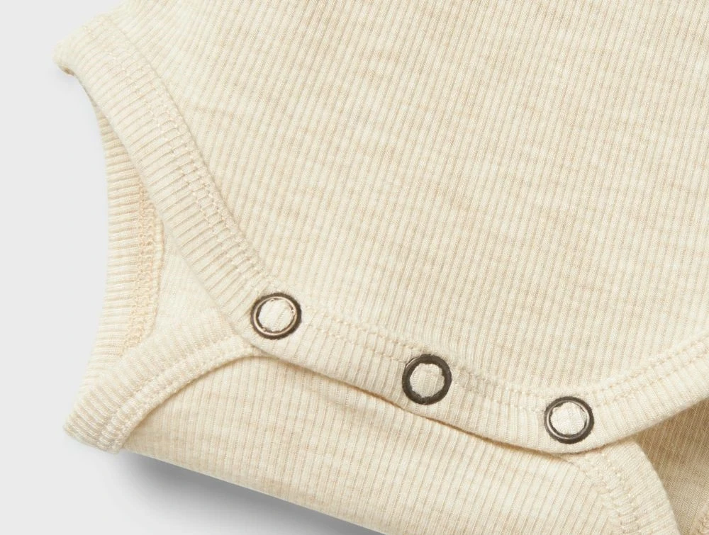 Langærmet body i blød ribkvalitet med rund halsudskæring og fin flæsekrave. Modellen har trykknaplukning ved skulderen og mellem benene, hvilket gør den nem at få af og på – også ved bleskift.
