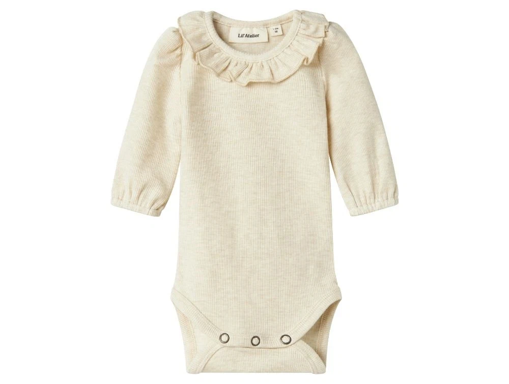 Body i meleret råhvid (turtledove melange) med flæsekrave fra Lil' Atelier.