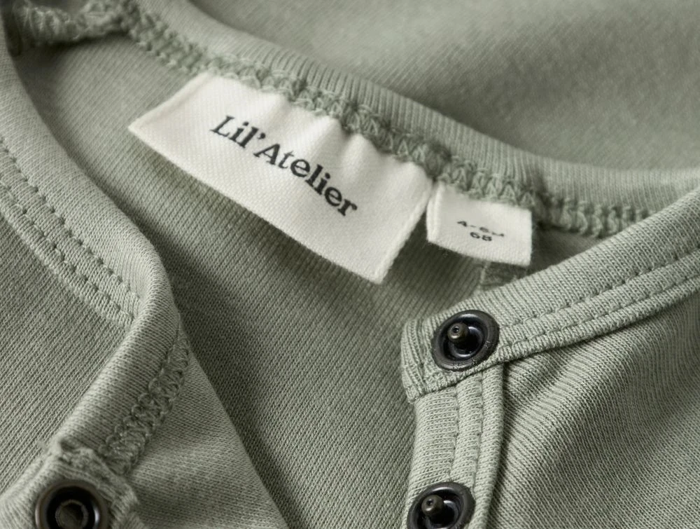 Body fra Lil\' Atelier i grøn seagrass med korte ærmerBody set bagfra fra Lil\' Atelier i grøn seagrassDetaljebillede af trykknapper og mærkning på Lil\' Atelier body i grøn