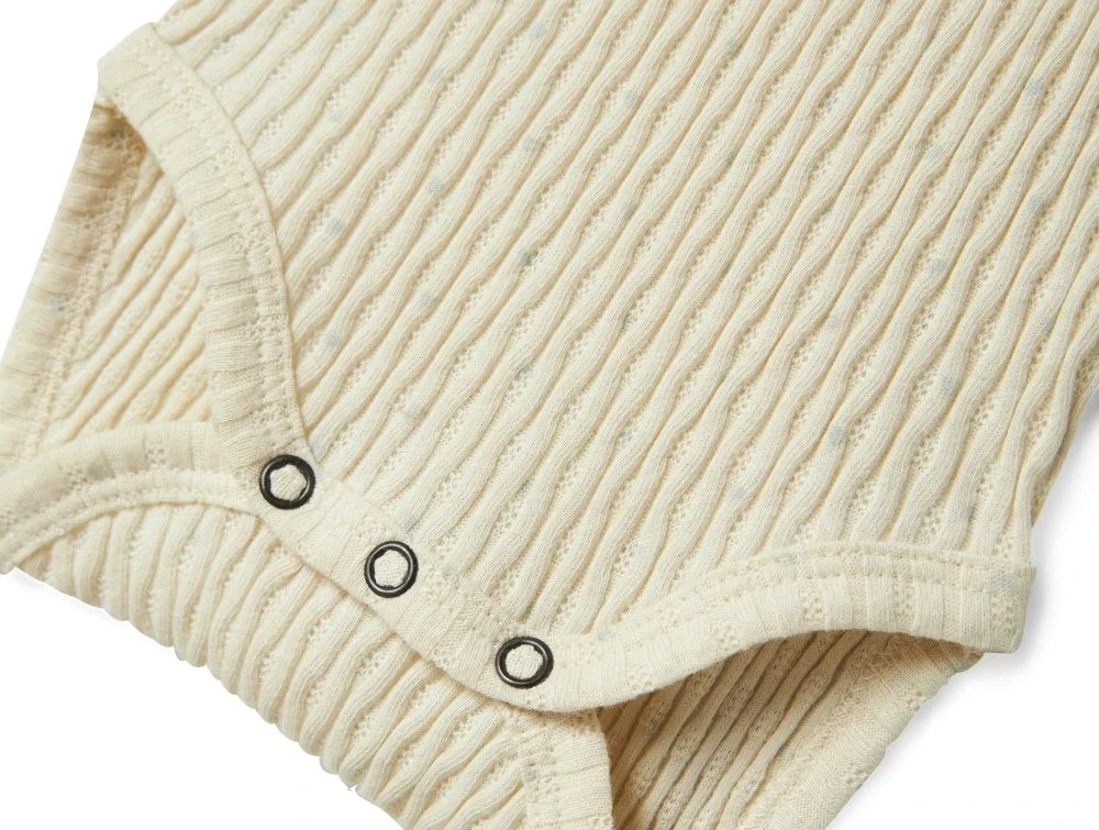 Bodyen er fremstillet i 100% økologisk bomuld i en blød og elastisk ribkvalitet med babylock-detaljer. Den har lange ærmer og trykknapper på skulderen og mellem benene.
