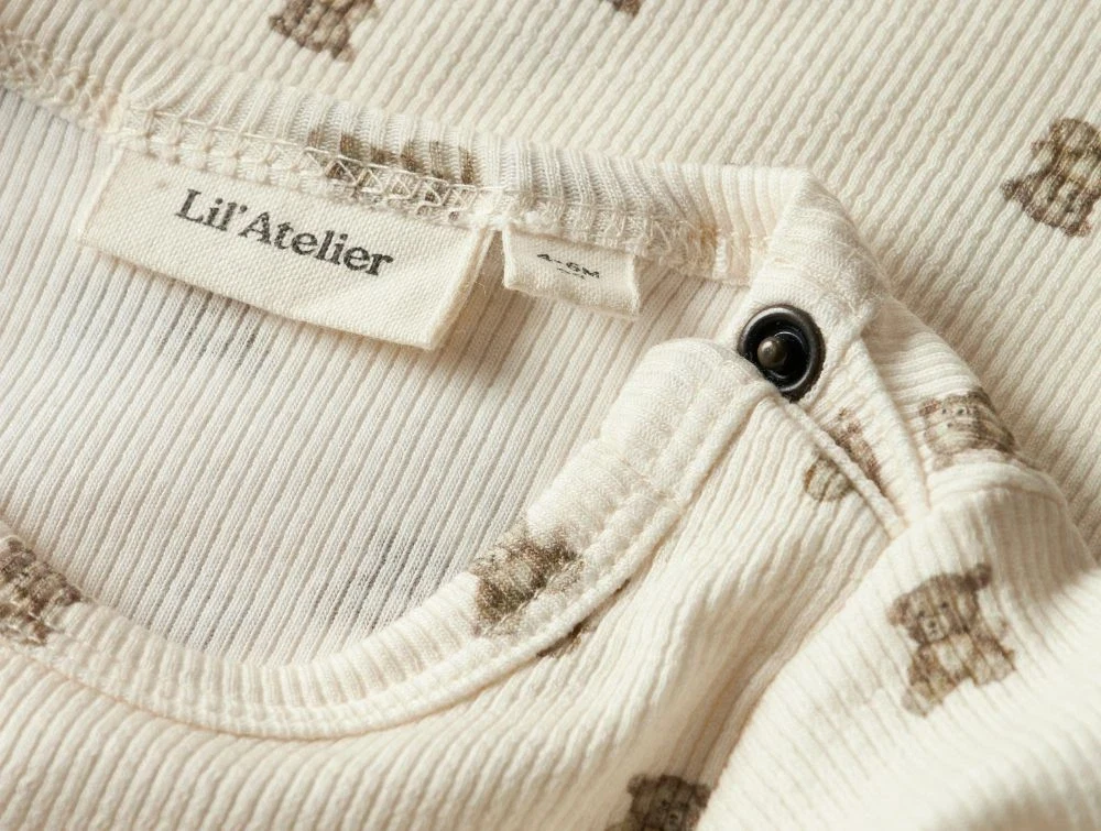 lil\' atelier body i beige med teddy bear-print og trykknapper, set forfrabagside af lil\' atelier body med teddy bear-print i beigenærbillede af label og trykknap på lil\' atelier body i beige med bjørneprint