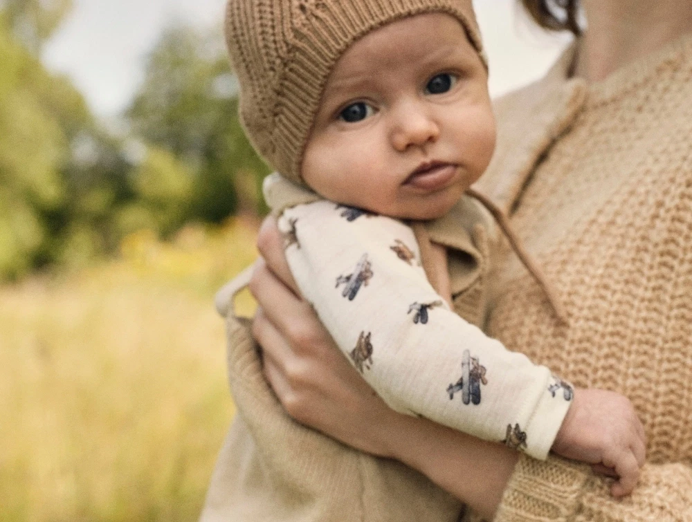 Fremstillet i en blød blanding af 60% merinould (RWS) og 40% modal (TENCEL™), der føles behagelig og skånsom mod babyens hud.