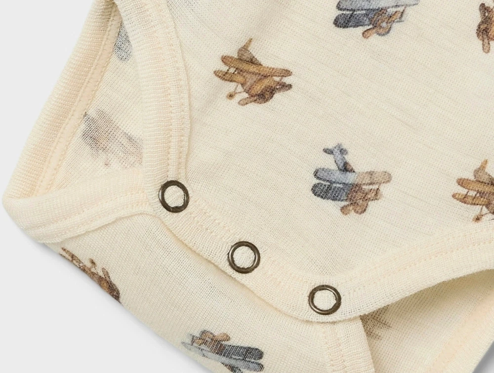 Lil\' Atelier body turtledove melange i uld modal med flyprintbaby iklædt Lil\' Atelier body i turtledove melange uld modal Trykknapper på Lil\' Atelier body i turtledove melange uld modalBagside af Lil\' Atelier body i turtledove melange uld modal