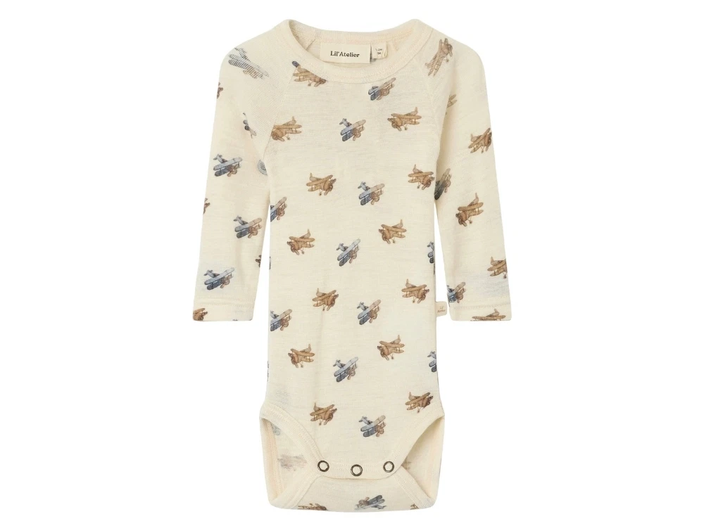 Body i råhvid nuance (turtledove melange) med flyprint fra Lil' Atelier.
