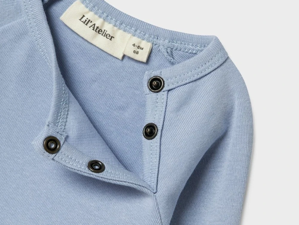 Body fra Lil\' Atelier i zen blue med lange ærmer og trykknapperNærbillede af hals og trykknapper på Lil\' Atelier body i zen blue