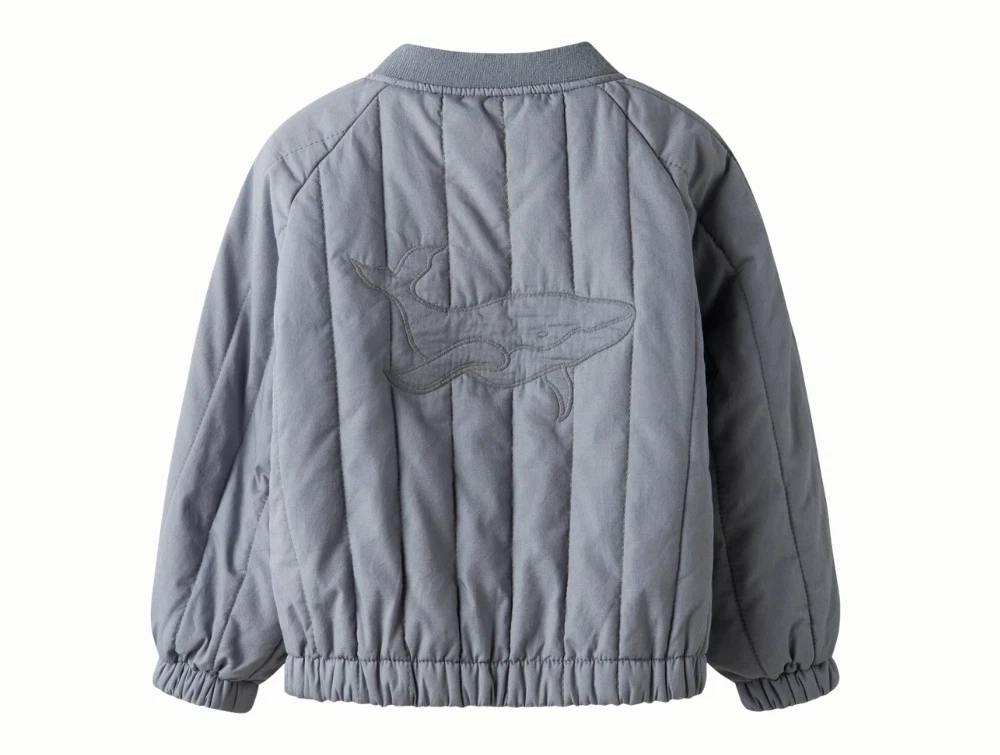 Bomberjakke i blå nuance (tradewinds) fra Lil' Atelier med broderet hvalmotiv på ryggen.