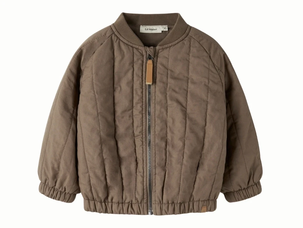 Den quiltede kvalitet giver et let og lunt lag i overgangsperioder, mens den varme brune tone skaber et roligt og naturligt udtryk. Jakken har almindelig pasform med elastiske afslutninger ved ærmer og bund.