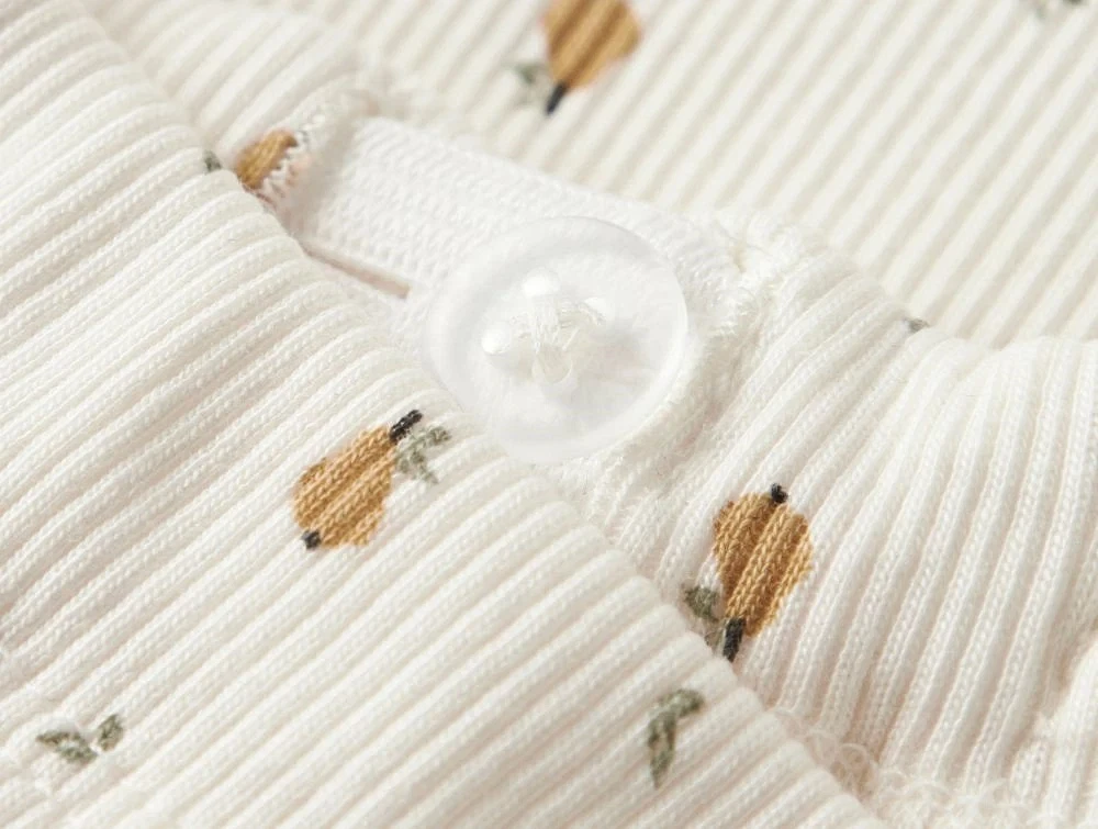 Ribstrikkede bukser i råhvid nuance (coconut milk) fra Lil' Atelier med et sødt pæreprint over det hele. Bukserne har almindelig pasform, bindebånd i taljen og justerbar elastik indvendigt, så de kan tilpasses barnet.
