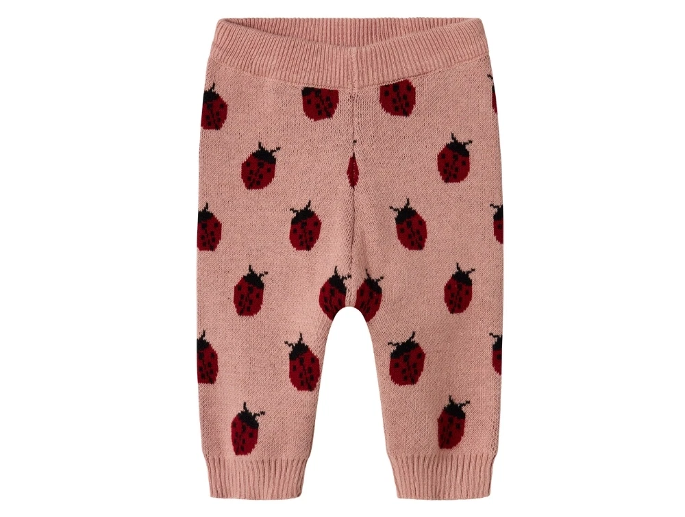 Bukser i rosa nuance fra Lil' Atelier med sødt mariehøneprint. De strikkede bukser har elastik i taljen med justerbar knap og ribkanter ved anklerne.