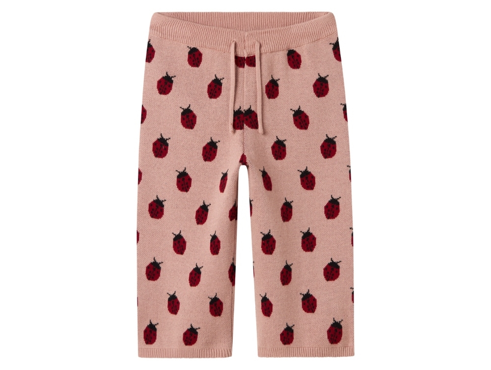 Bukser i rosa nuance fra Lil' Atelier med charmerende mariehøneprint. En strikket model med brede ben, justerbar elastik i taljen og fast bindesnøre.