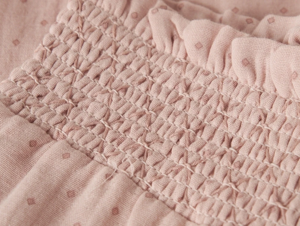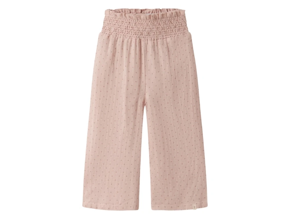 Bukser i rosa nuance (peach whip) fra Lil' Atelier med smock-detalje i taljen og vidde i benene.