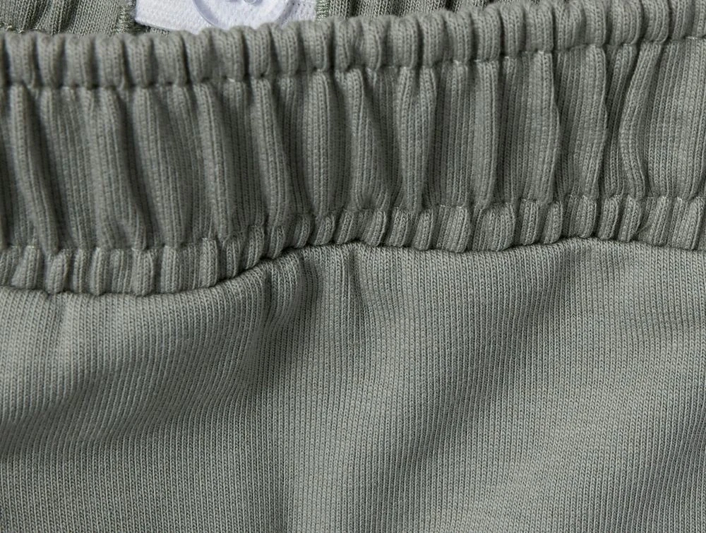 Bukser fra Lil\' Atelier i seagrass med elastik og snøre i taljenNærbillede af talje og materiale på Lil\' Atelier bukser i seagrass