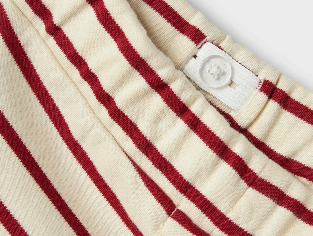 Bukser i råhvid nuance fra Lil' Atelier med røde striber. En blød jerseymodel med elastik i taljen og brede ben, som giver et afslappet og behageligt fit.