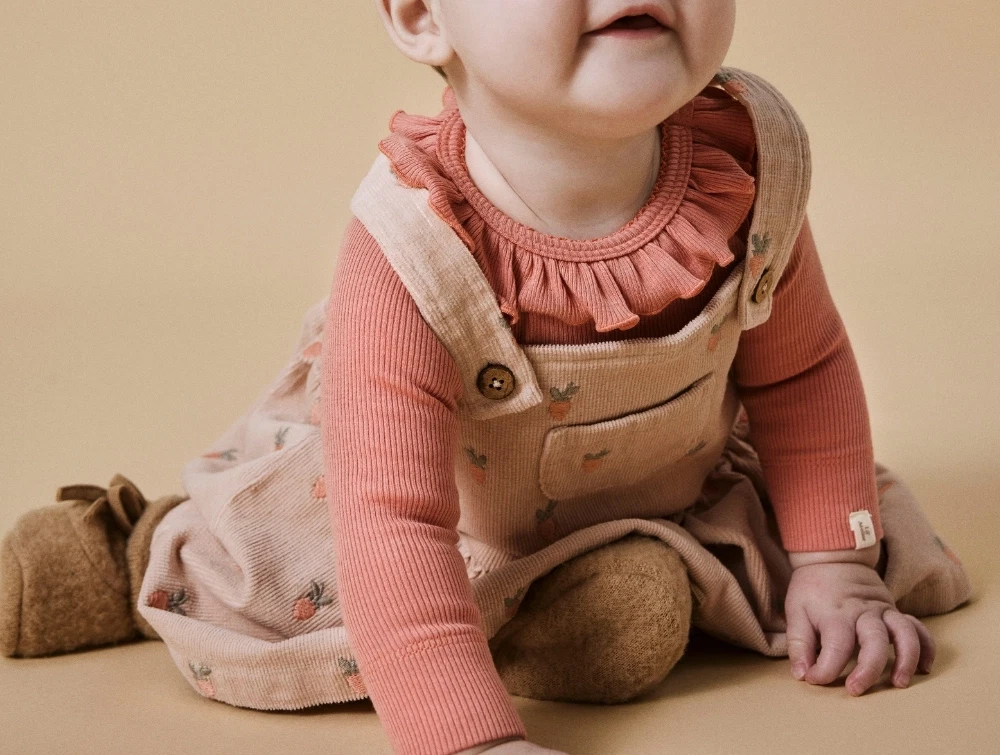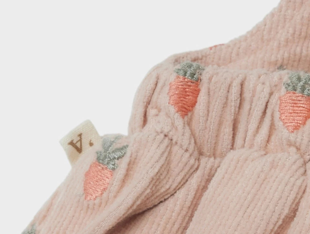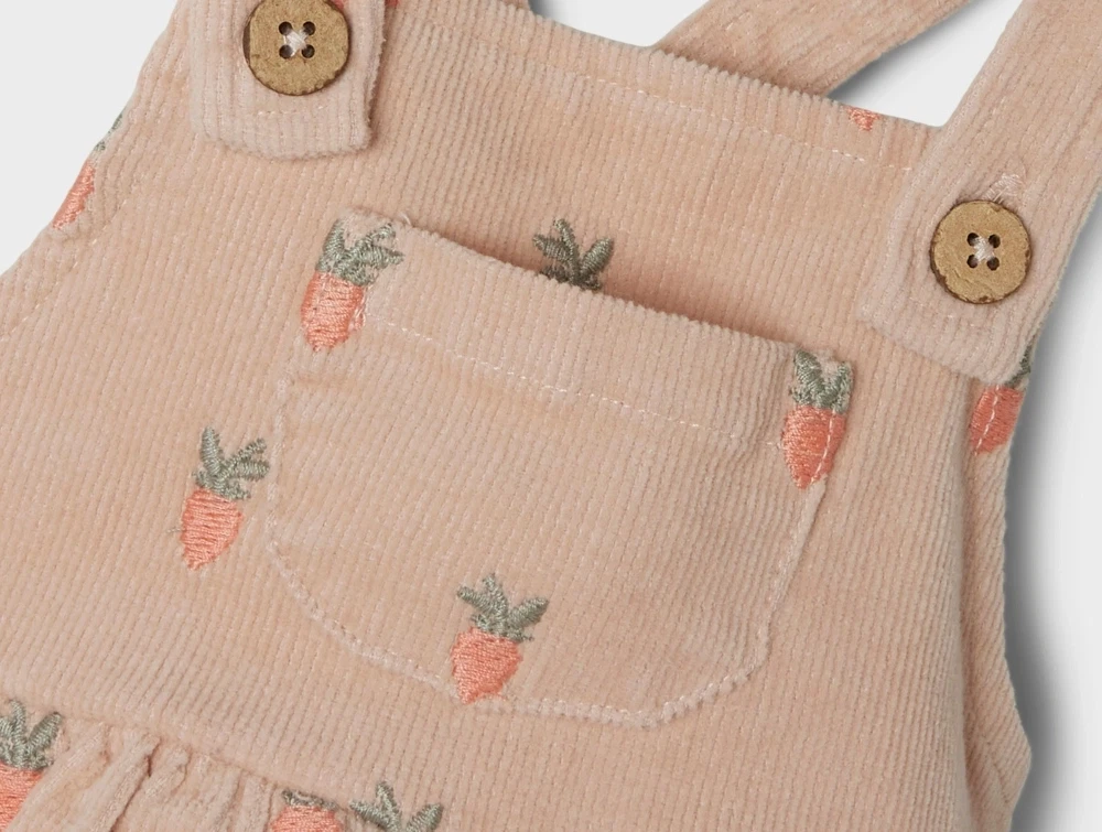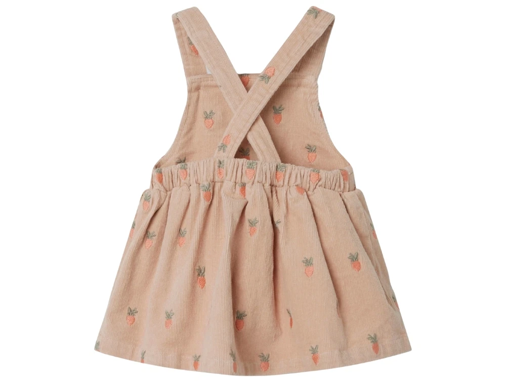 Kjolen er lavet af fløjl med en blød følelse og en ribbet overflade. Den har et skirtall design og lukkes med knapper, hvilket gør det nemt at tage på og af. Derudover har den en fin lille brystlomme til små skatte.