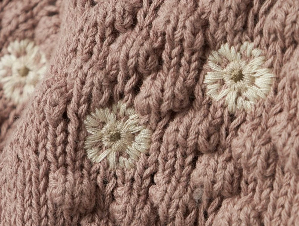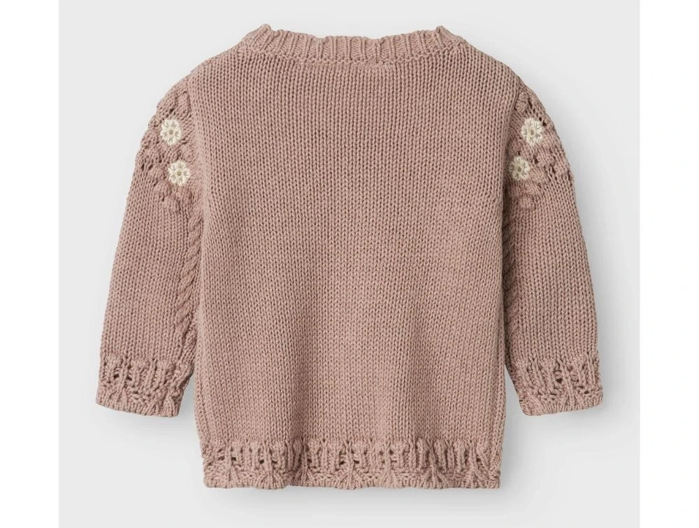 Cardiganen har lange ærmer og knaplukning, som giver et klassisk udtryk. De fine muslingedetaljer og broderede blomster tilføjer et sødt touch.