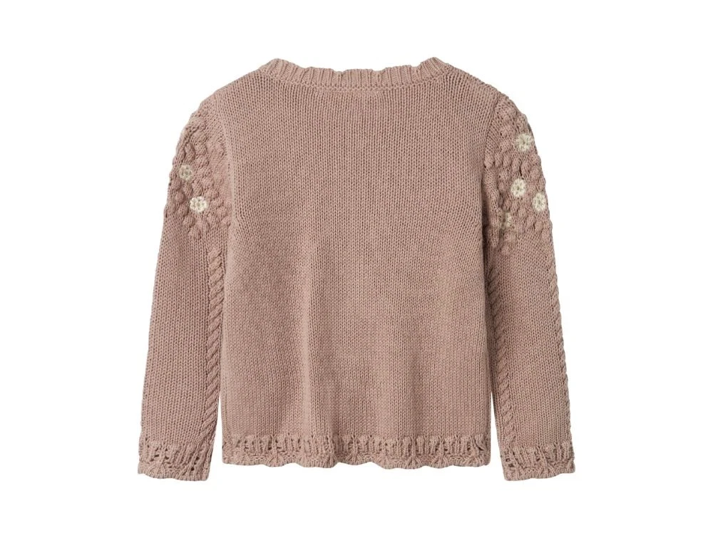 Cardiganen har lange ærmer og knaplukning, som giver et klassisk udtryk. De fine muslingedetaljer og broderede blomster tilføjer et sødt touch.
